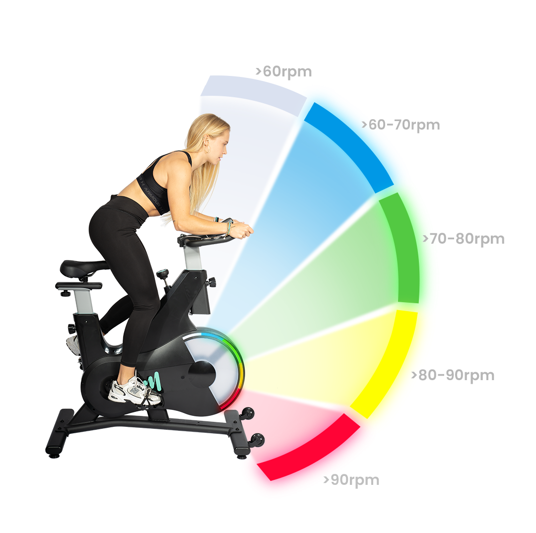 La luz LED cambia de color al ritmo de tus pedaladas por minuto.