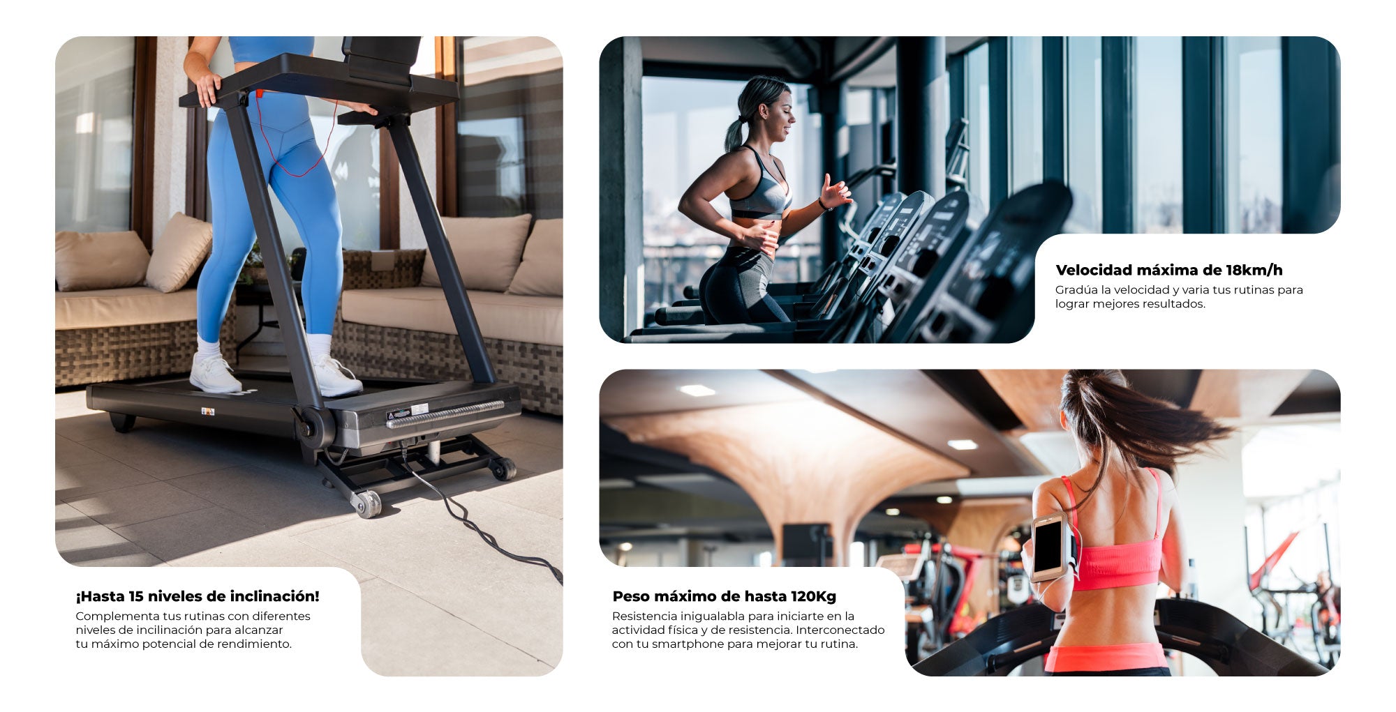 Con velocidad de hasta 18 km/h y 15 niveles de inclinación, nuestra trotadora supera tus expectativas y te lleva mejorar exponencialmente tus rutinas.